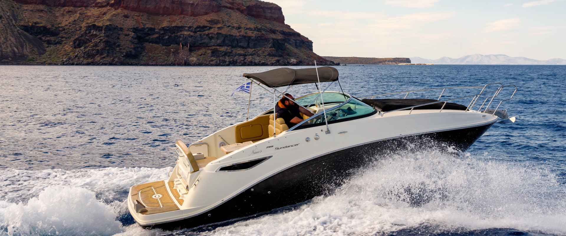 Get onboard our luxurious Sea Ray 265 Sundancer yacht with an open-air cabin with large windows and an extremely comfortable seating area for an amazing and unforgettable morning cruise. Visit unique beach sites, travel along the caldera cliffs; dive at the Volcano’s hot springs and enjoy swimming and snorkeling in the deep blue Aegean Sea.