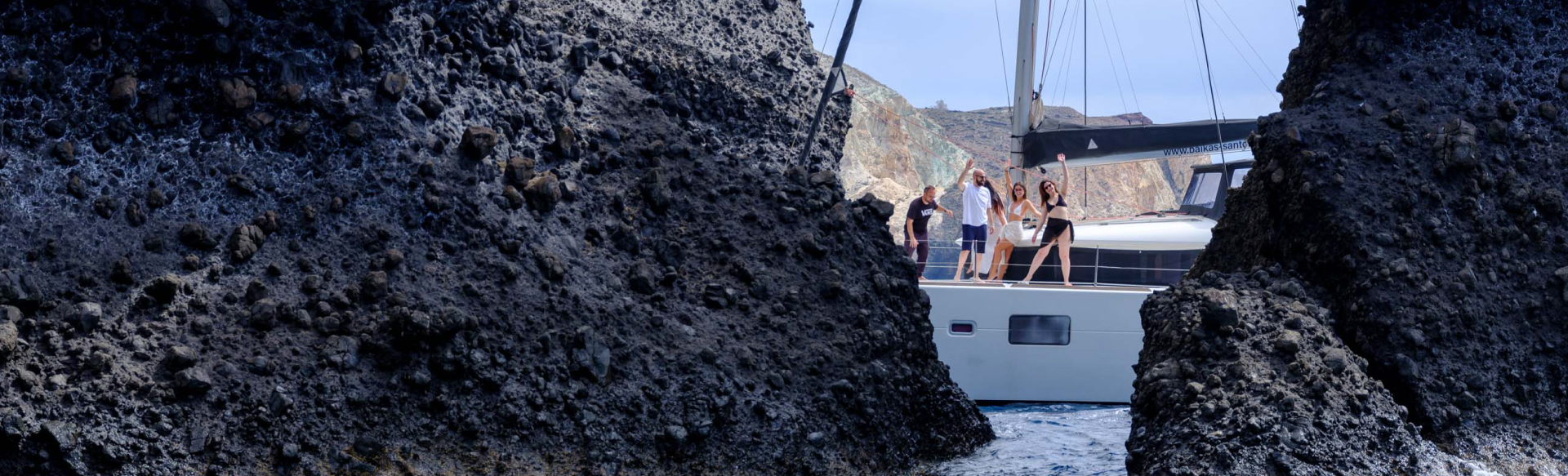 Book a spot for you and your friend(s) and get onboard our luxurious Catamaran that can carry up to 18 persons for an amazing and unforgettable morning semi-private cruise. Visit unique beach sites, travel along the caldera cliffs; dive at the Volcano’s hot springs and enjoy swimming and snorkeling in the deep blue Aegean Sea.