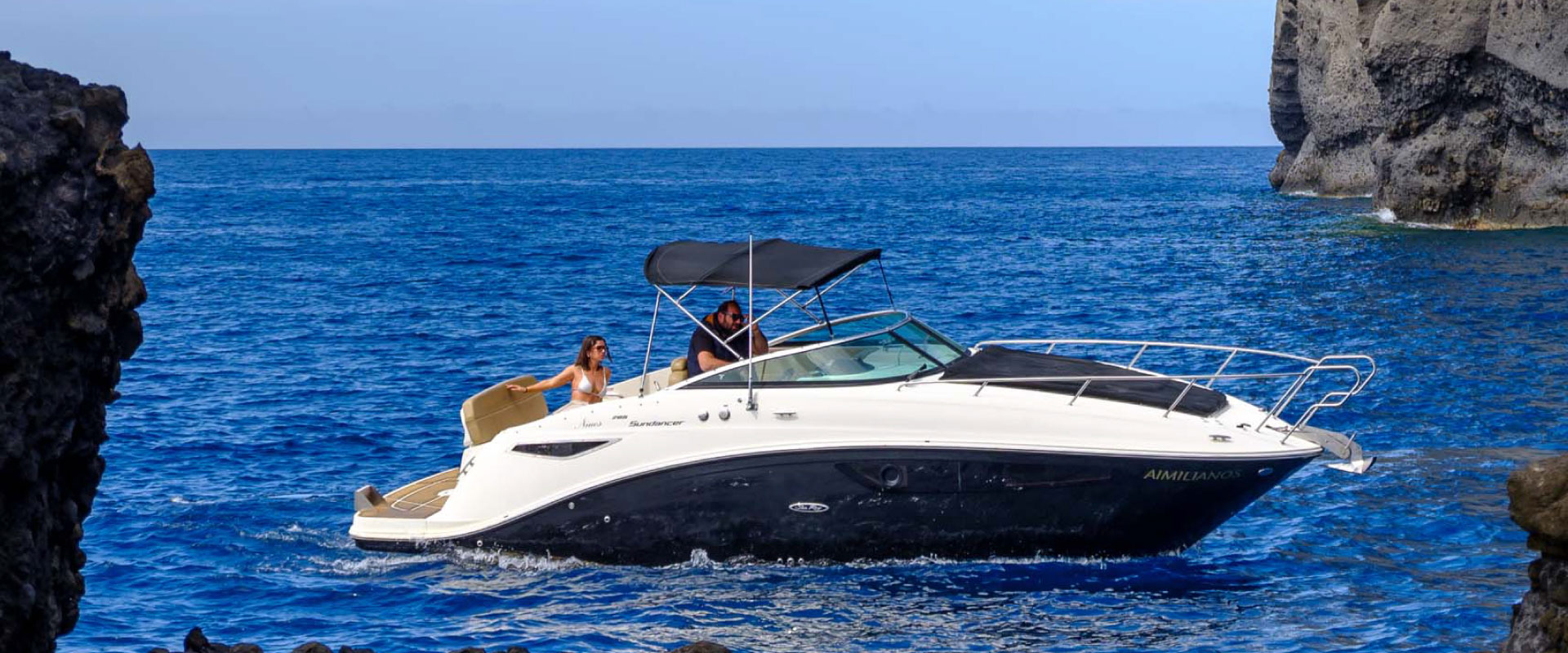 Enjoy an amazing private cruise around Santorini aboard our Sea Ray 265 Sundancer. Live an amazing experience on a luxurious 27-feet vessel with an open airy cabin with large windows that can accommodate up to 7 persons. Discover the magical spots Santorini has to offer during an unforgettable cruise accompanied by delicious food and drinks, and enjoy a convenient interaction with the deep blue Aegean Sea by using the vessels swimming platform. The beautifully crafted Sea Ray 265 Sundancer has an excellent hull design that makes the ride quality effortlessly smooth and combined with our experienced captain guarantee a first class travel experience with great photo and video opportunities.